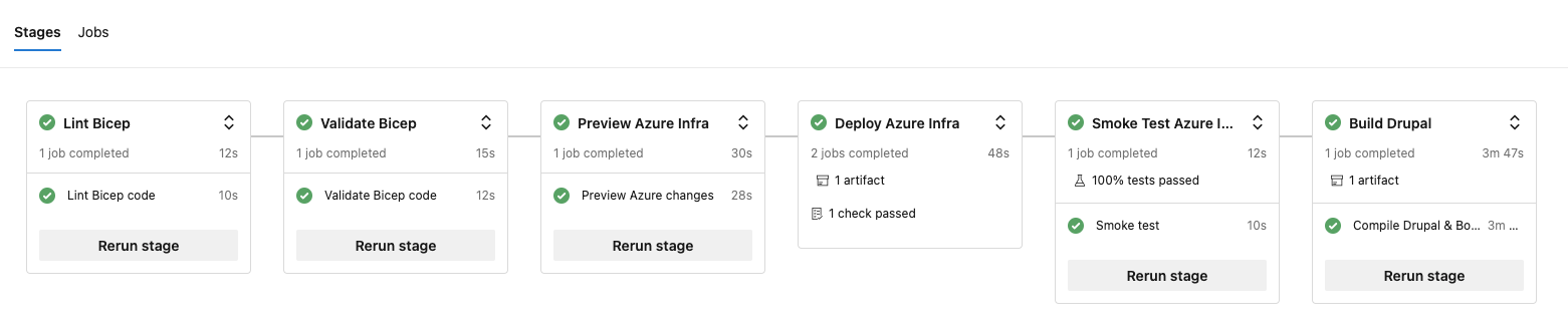 Once the CI pipeline is out in the wild it becomes the only way that changes can be made to our Azure infrastructure and Drupal code. This enforces quality checks before, during and after deployment.