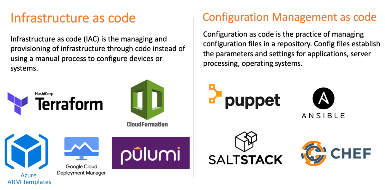 There is confusion over Infra as Code and Config Management as Code, on the surface they appear to do the same thing. The definition and popular tools for each are shown below: