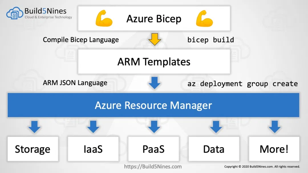 Bicep is integrated with the Azure CLI, its commands can be run alongside others when deploying, e.g: