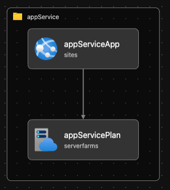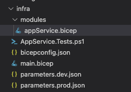 Using a modular approach the main file passes parameters into appService.bicep which creates the resources and passes back output variables. The parameters.{env}.json files are used in the Azure pipeline later to override default parameters in main.bicep at runtime.