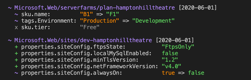 We won't go through all the code steps here but you can find excellent content on MS Learn. One useful feature was using a configuration map to change the tier and tags of the App Service Plan based on the passed in environmentType parameter. So the dev environment can use the Free tier to save on costs.