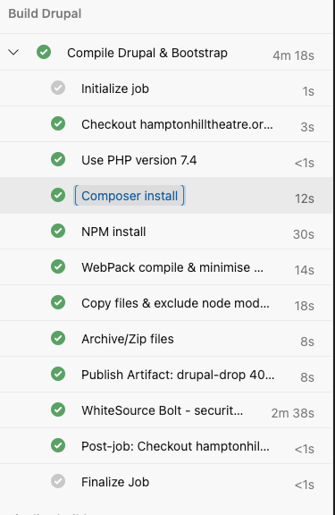 As mentioned in the last post Drupal has front and back end package management so Composer, NPM and WebPack tasks had to be run to ensure the PHP and Bootstrap dependencies were compiled and ready.
