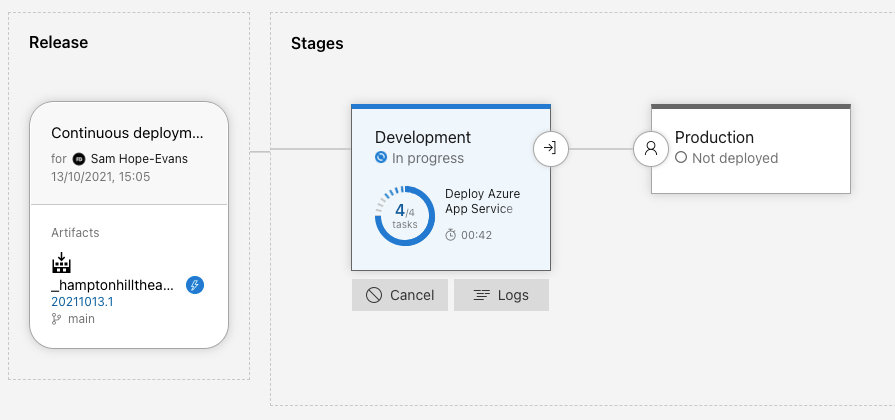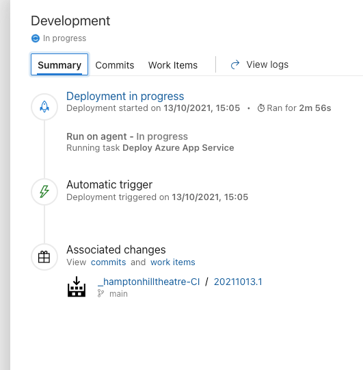 When the CI build is finished this automatically triggers the release pipeline. The first stage is to deploy to the Dev App Service: