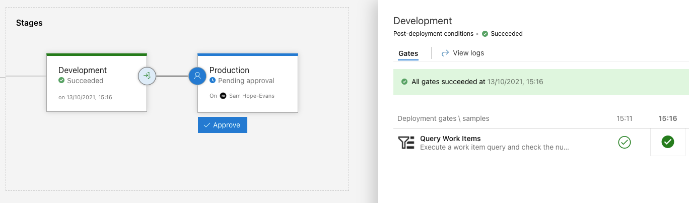 The Development stage has 2 Post-deployment Gates triggered after an OK deploy: